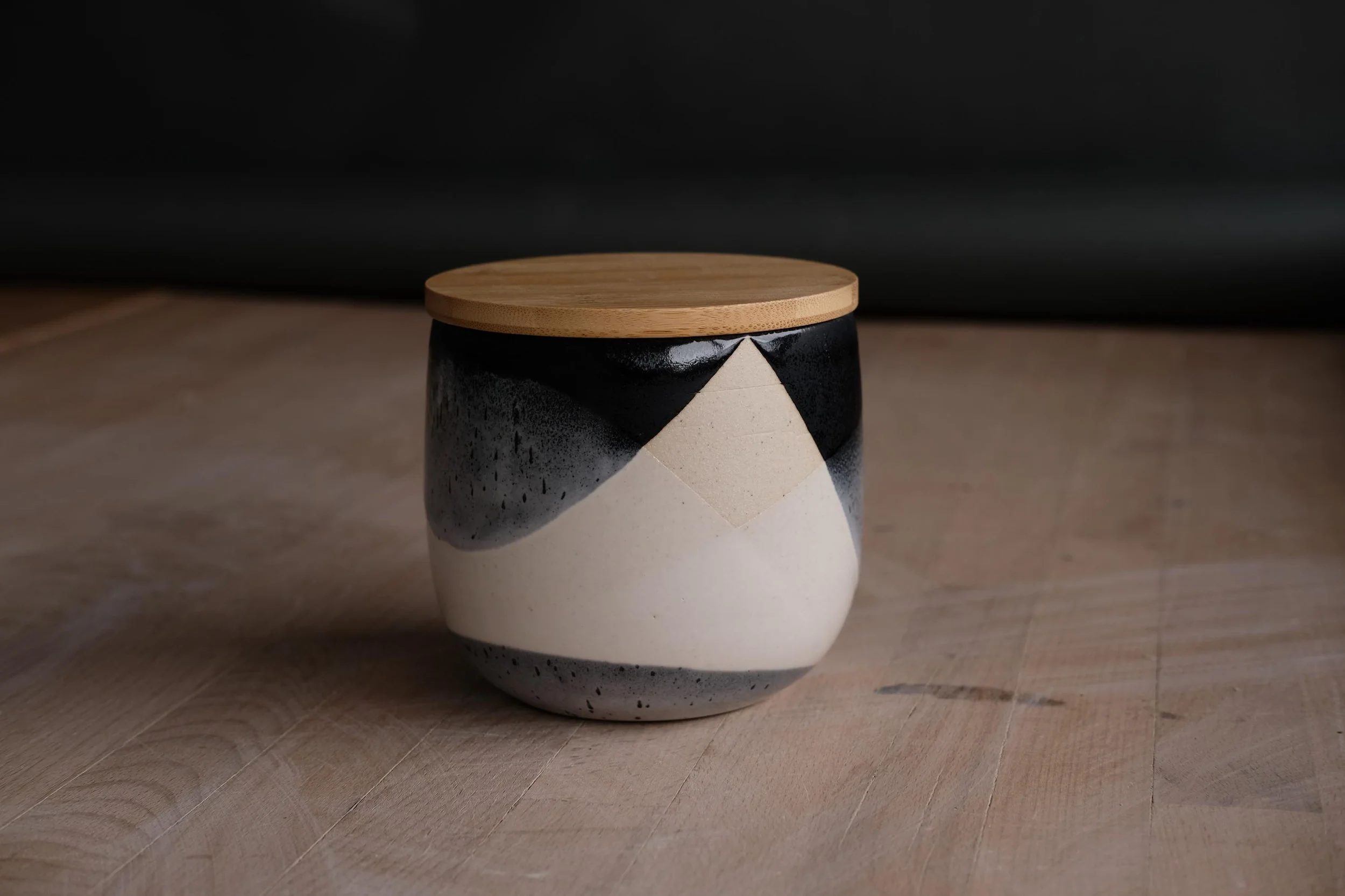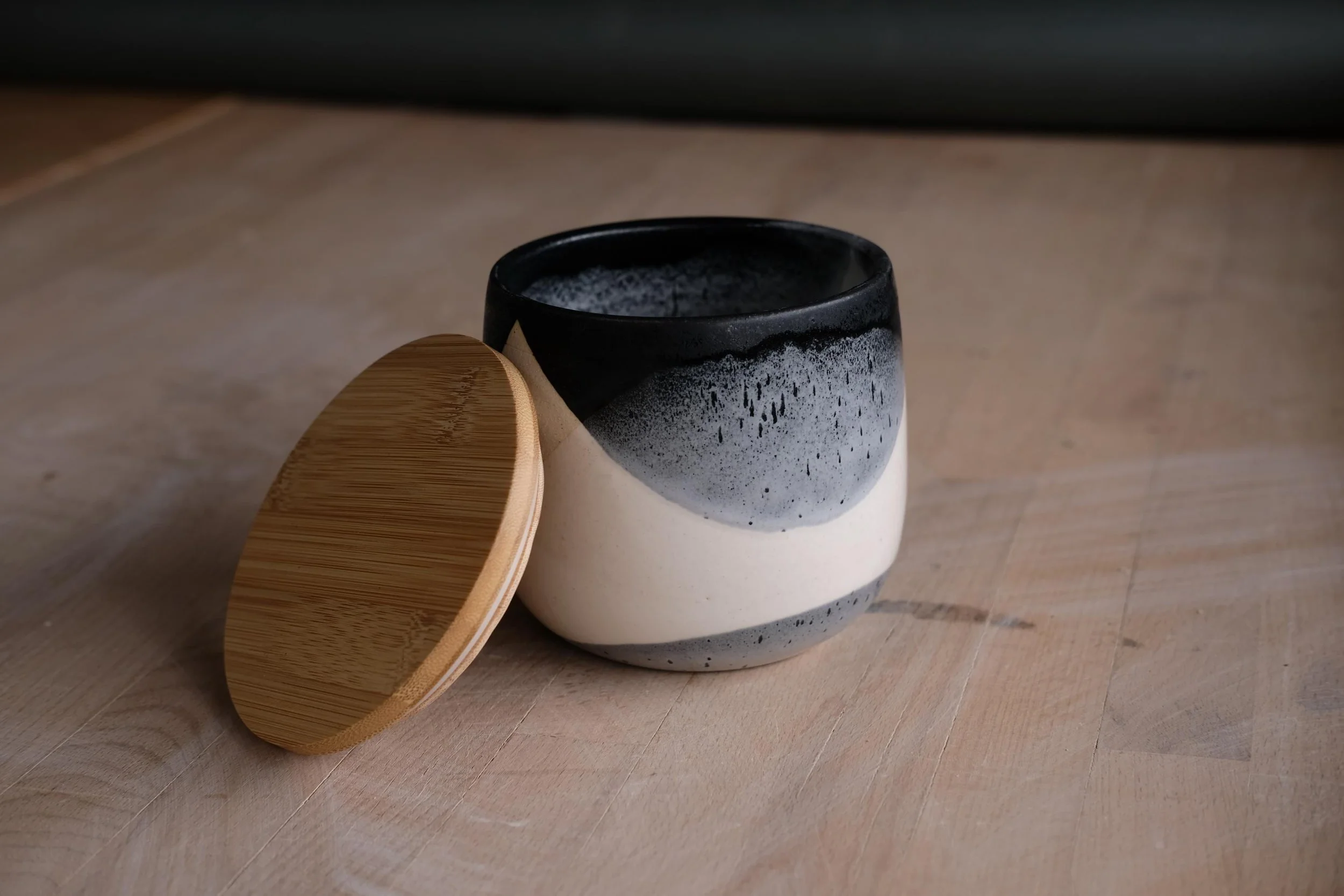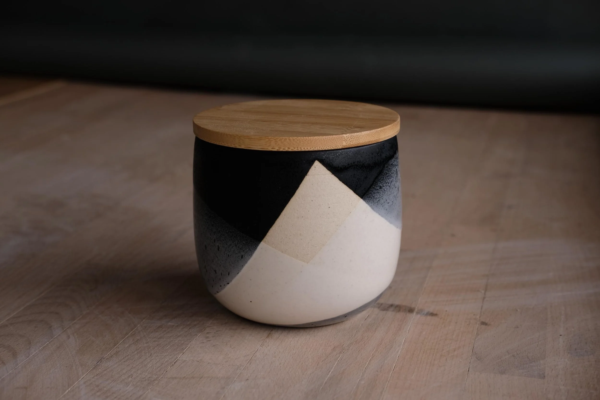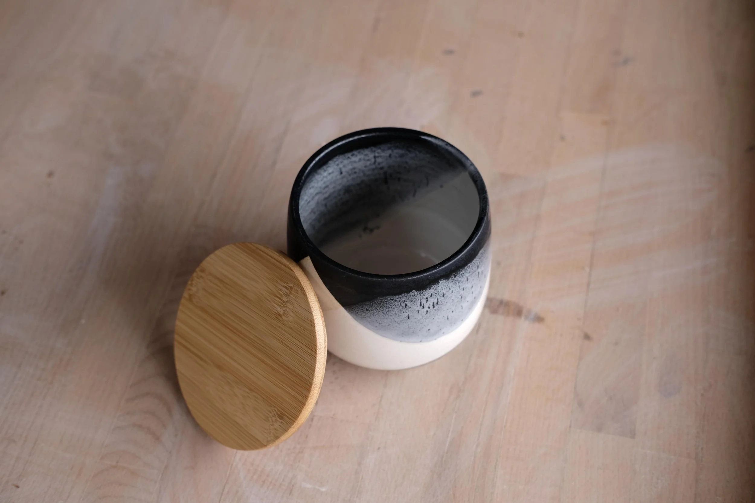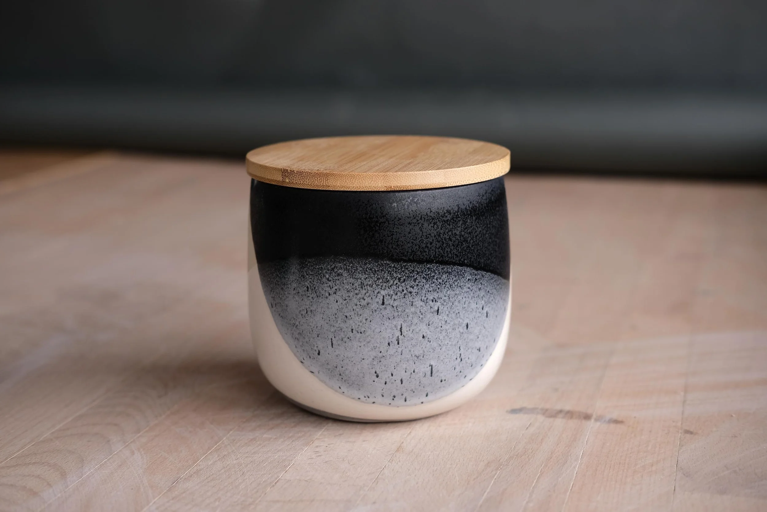 Handmade stoneware lidded jar Its rounded shape fits perfectly and comfortably in the palm of your hand. perfect for dry food storage, bathroom or to use like a little box of treasures. — D4.5" H4.5" — All my ceramics are hand thrown on the wheel, trimmed, bisque fired, sanded, glazed and fired again. — Handmade ceramics have beautiful imperfections that makes them unique. — The glaze is food safe, durable, dishwasher and microwave safe.