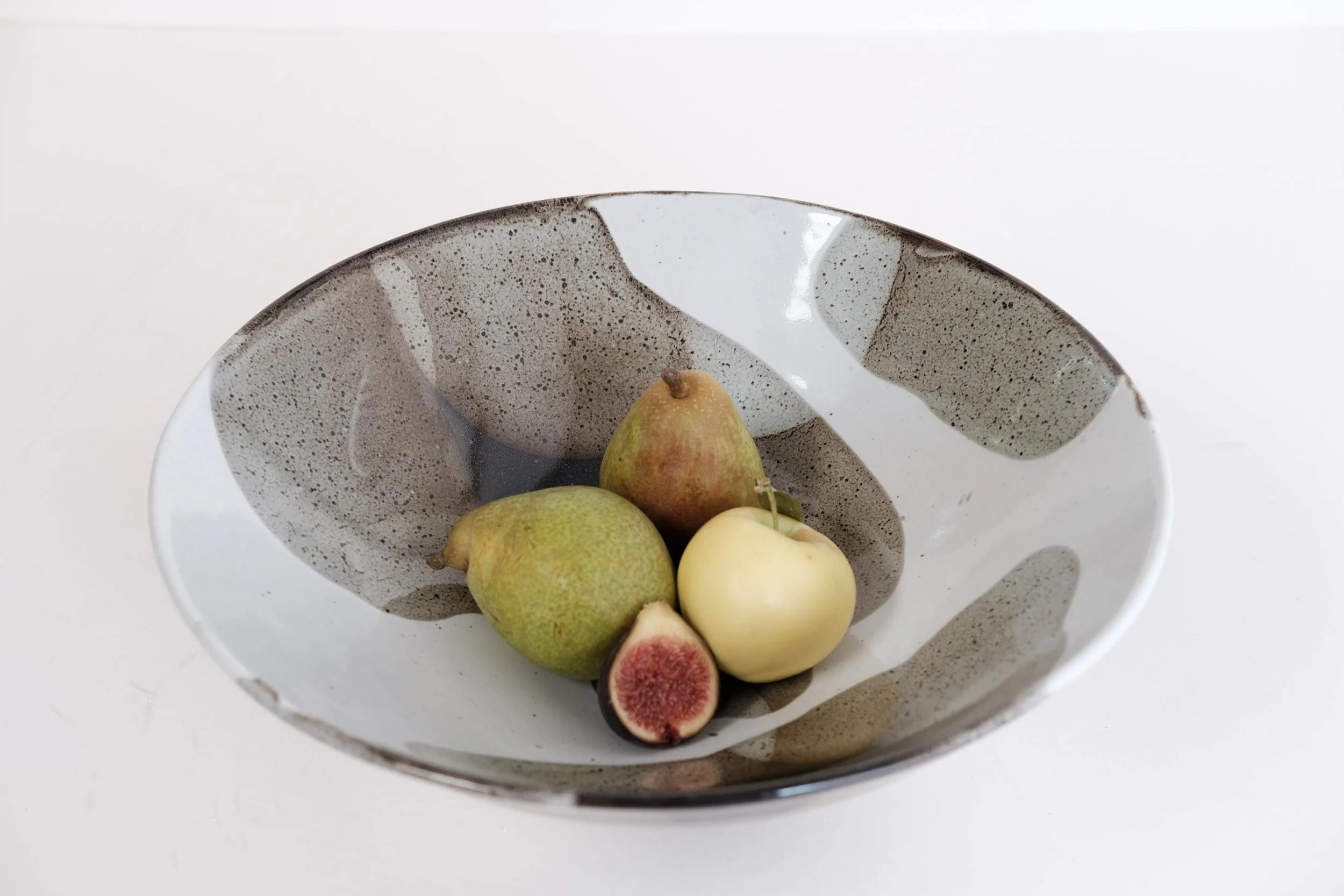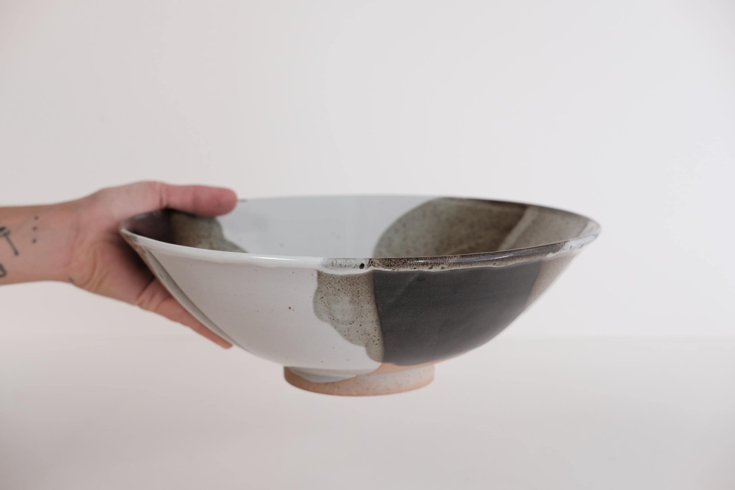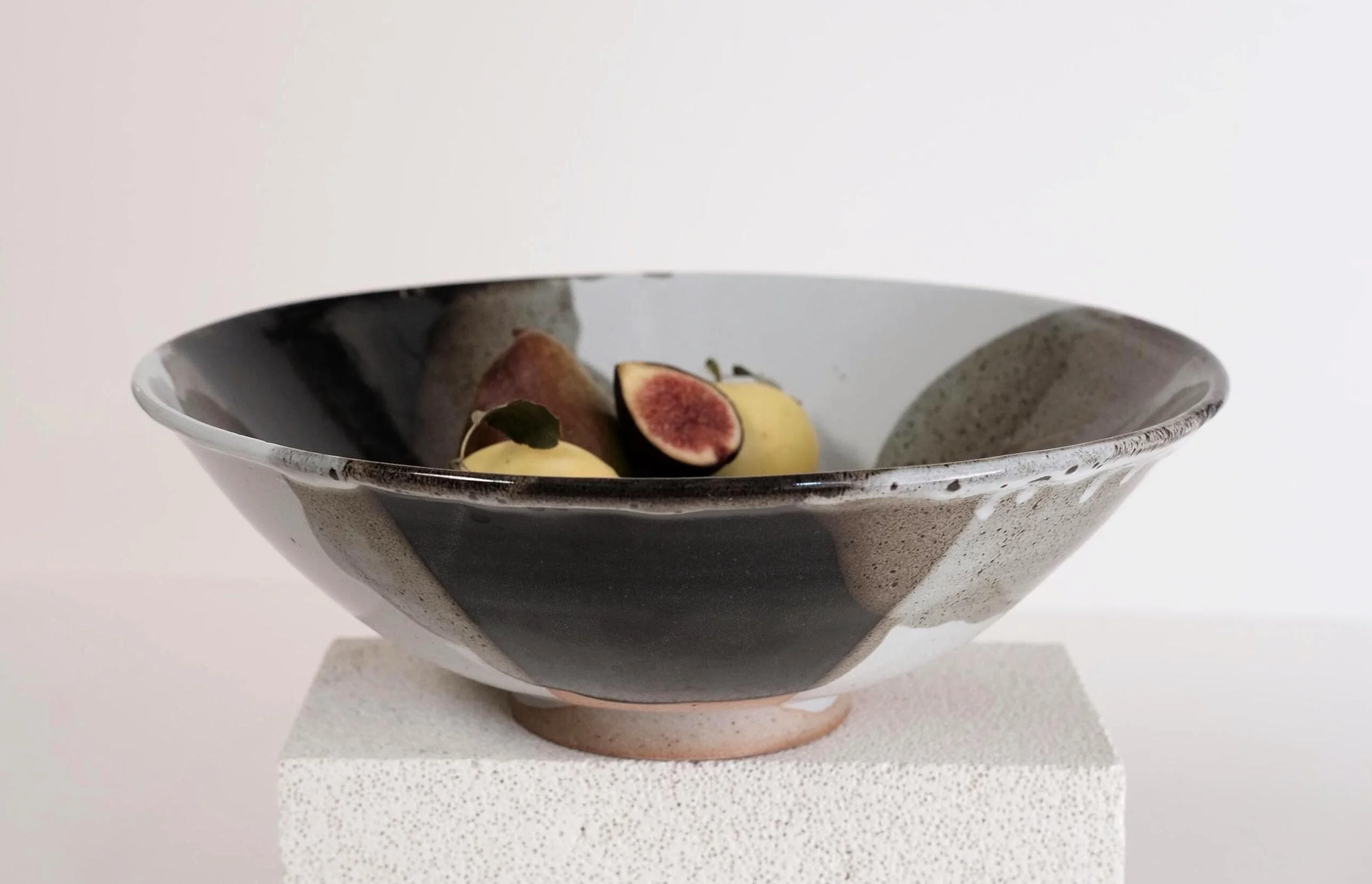 Handmade stoneware large serving bowl Stunning one of a kind statement piece to decorate a dinning table, a credenza, present fresh fruits or serve salad to your hosts. — W 12’’ - H 4’’ — Handmade ceramics have beautiful imperfections that makes them unique. — The glaze is food safe, durable, dishwasher and microwave safe.